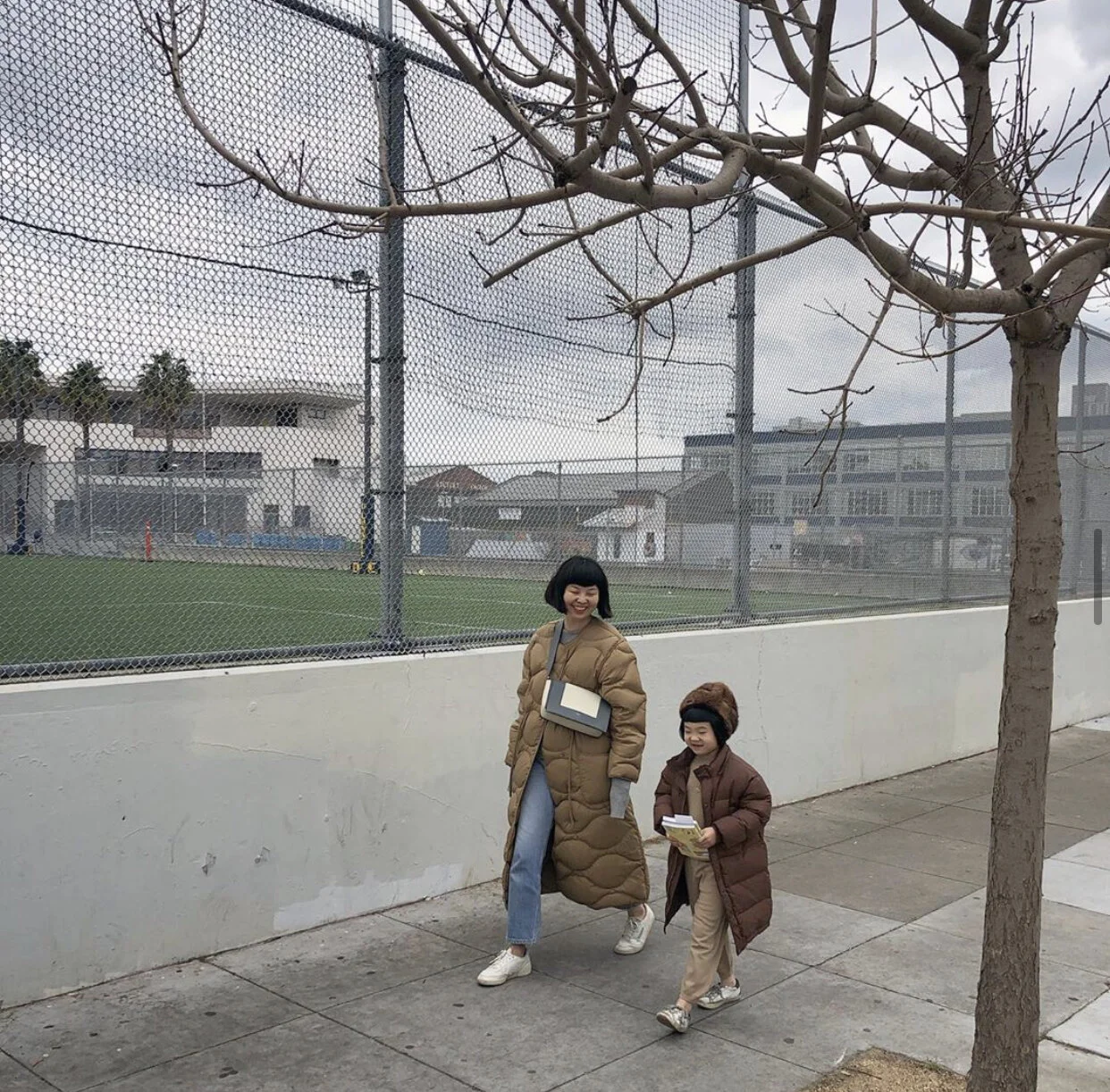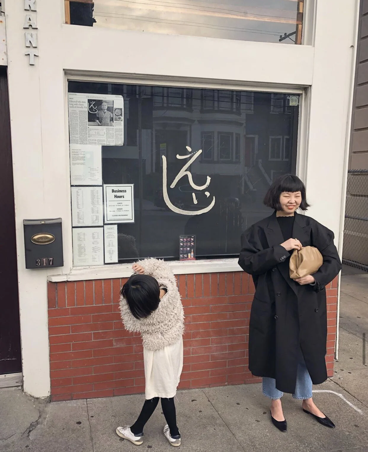 Mom is a mix of cool minimal street wear and Old-Céline (or Lemaire when she is in Paris), Marni is in comfy + sophisticated elements, like airy slightly oversized cream color dress or a fur hat that reminds of my grand-grandmother. Swell girls on the go to their favorite matcha restaurant.
