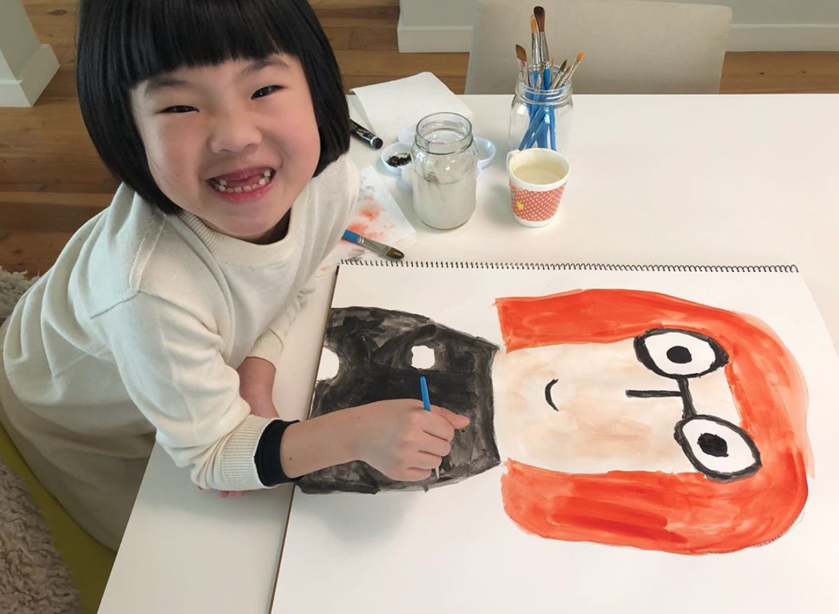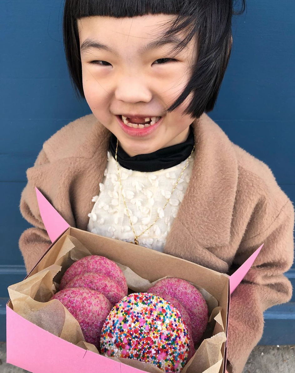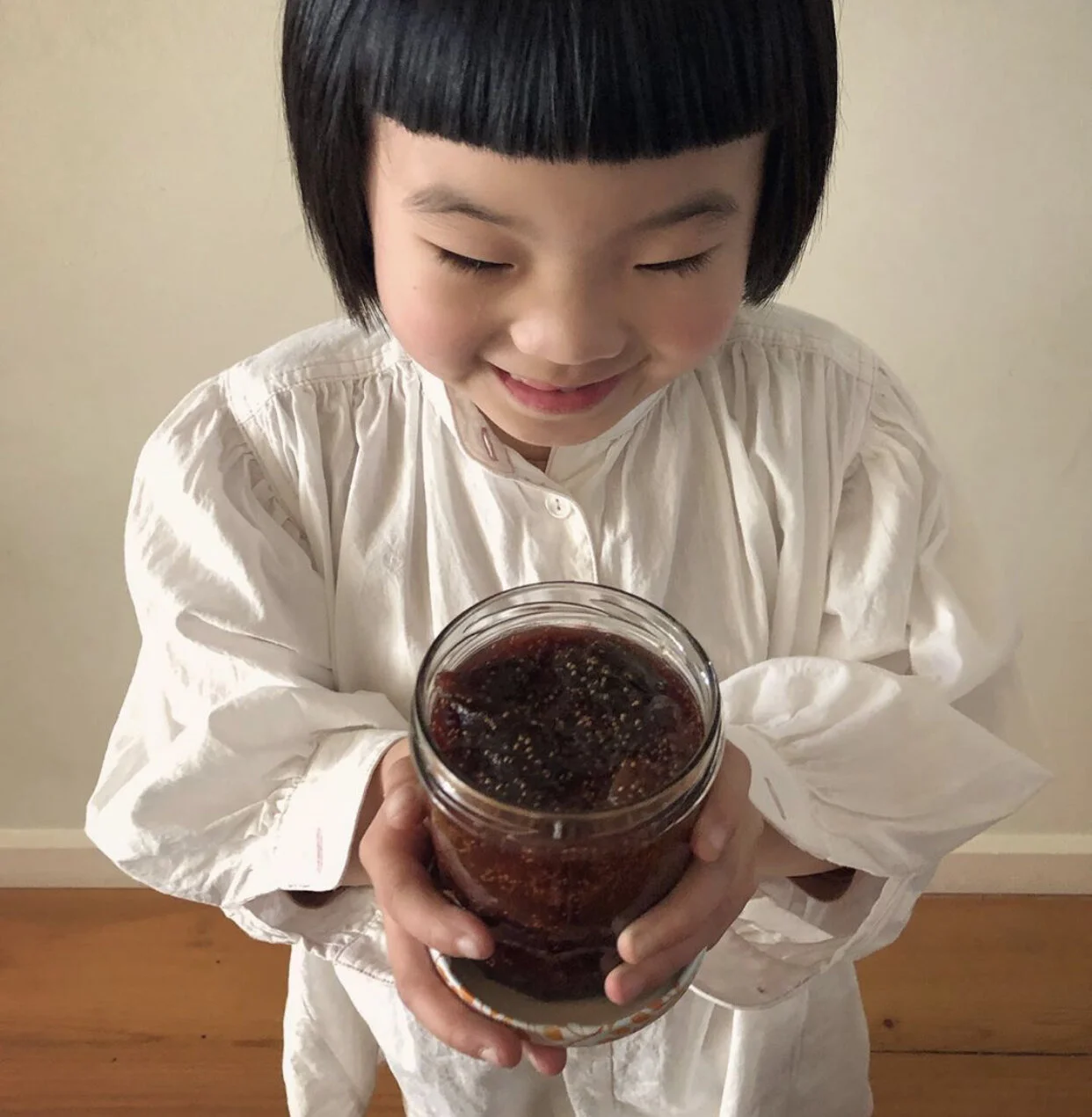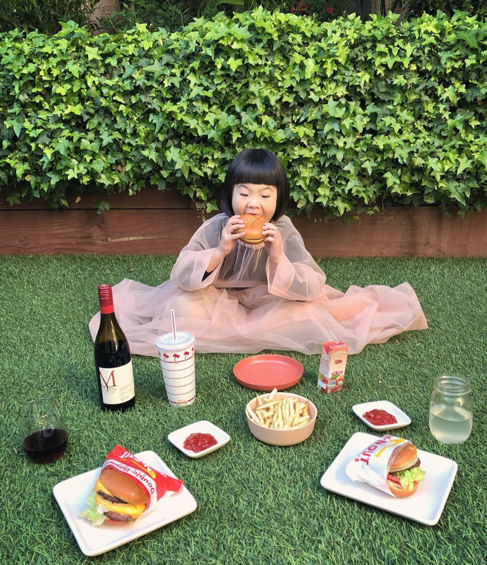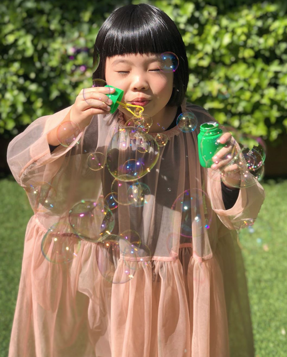 During self-isolation regime introverts and homebodies Helen + her husband (parents of little Marni) cook, sing, and produce themed picnics in their backyard. Marni, their multi-talented + funny extrovert daughter paints Yayoi Kusama in masks. Her obsession with this Japanese artist is obvious, and I have a feeling this girl will choose a creative path for herself, too. But the future will show. Let's speak about now. “45 minutes drive to my parents is super relaxing,” says Helen, as well as bath, yoga on zoom and some yum San Francisco take-aways. Here is how they relish quarantine, both girls dressed-up in their cool minimal outfits (old Céline for Helen, hello!).